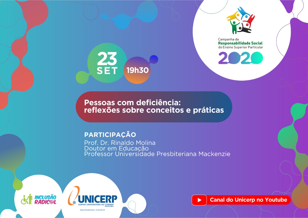 Acompanhe a palestra com tema “Pessoas com deficiência: reflexões sobre conceitos e práticas”, ministrada pelo Prof. Dr. Rinaldo Molina, doutor em Educação pela USP - São Paulo e professor da Universidade Presbiteriana Mackenzie. A apresentação faz parte da Campanha de Responsabilidade Social de 2020, cujo tema é a Inclusão das Pessoas com Deficiência.