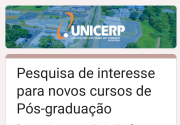 Esta pesquisa tem como objetivo identificar as necessidades e interesses da população em relação à criação de novos cursos de pós-graduação lato sensu (especialização) no UNICERP. Suas respostas ajudarão a orientar o desenvolvimento de programas mais alinhados com a realidade profissional e regional.
