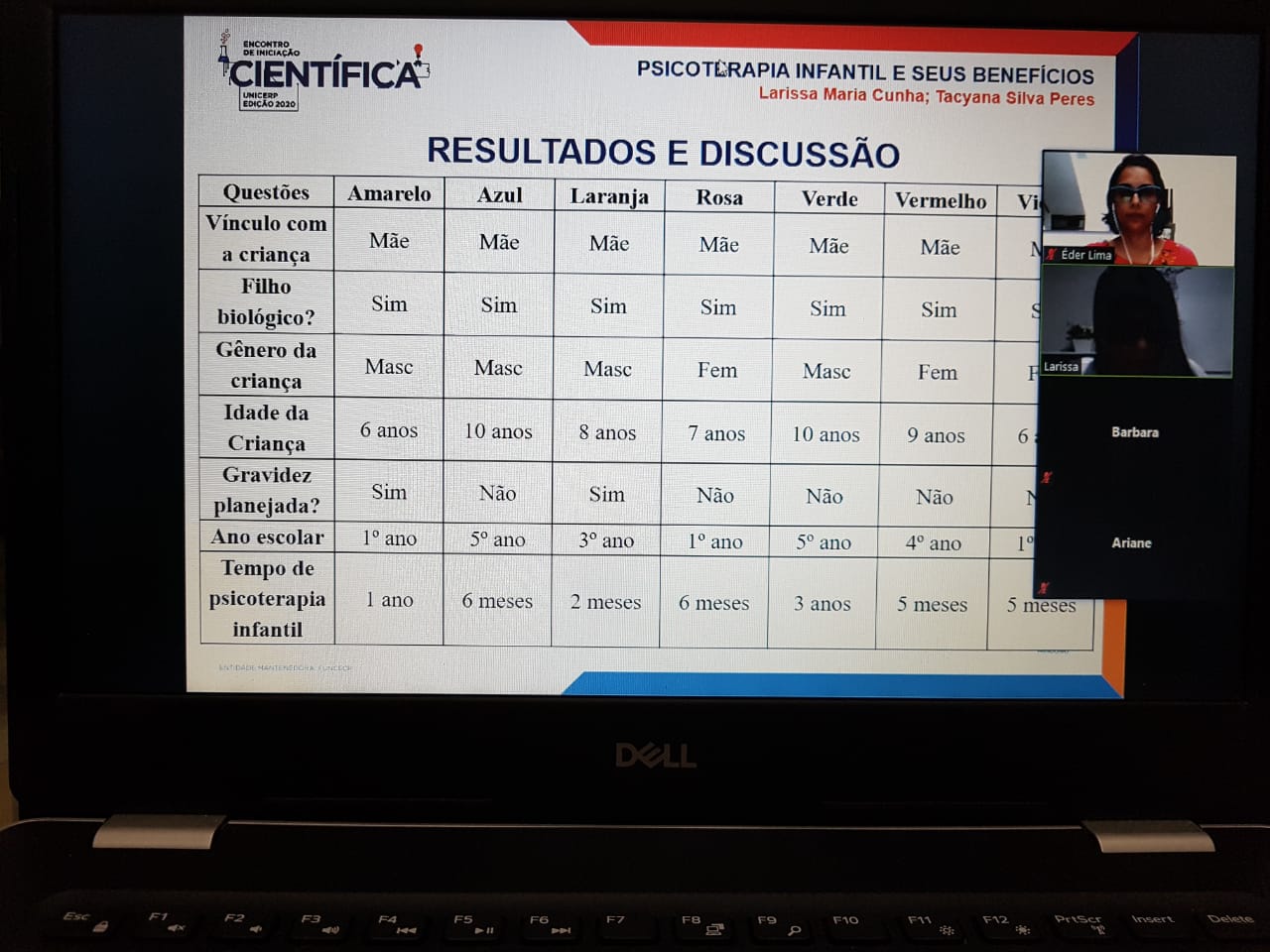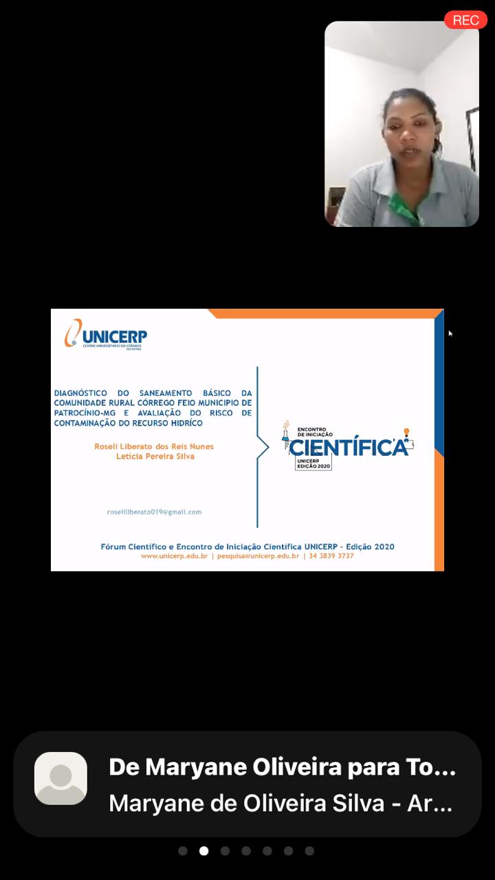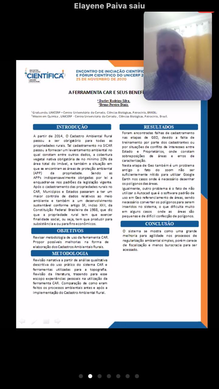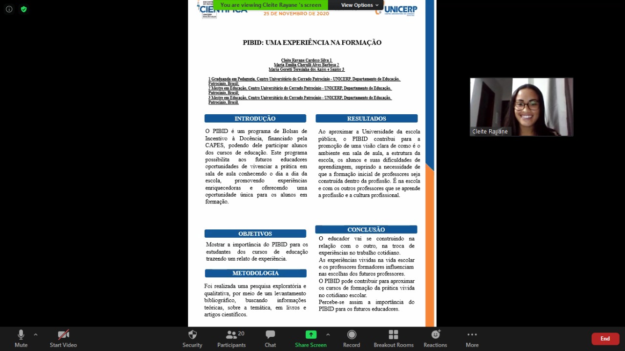 Logo após a palestra, ocorreram as apresentações dos trabalhos deferidos. As exposições foram transmitidas em salas de reuniões do Zoom, com trabalhos foram divididos em áreas temáticas.