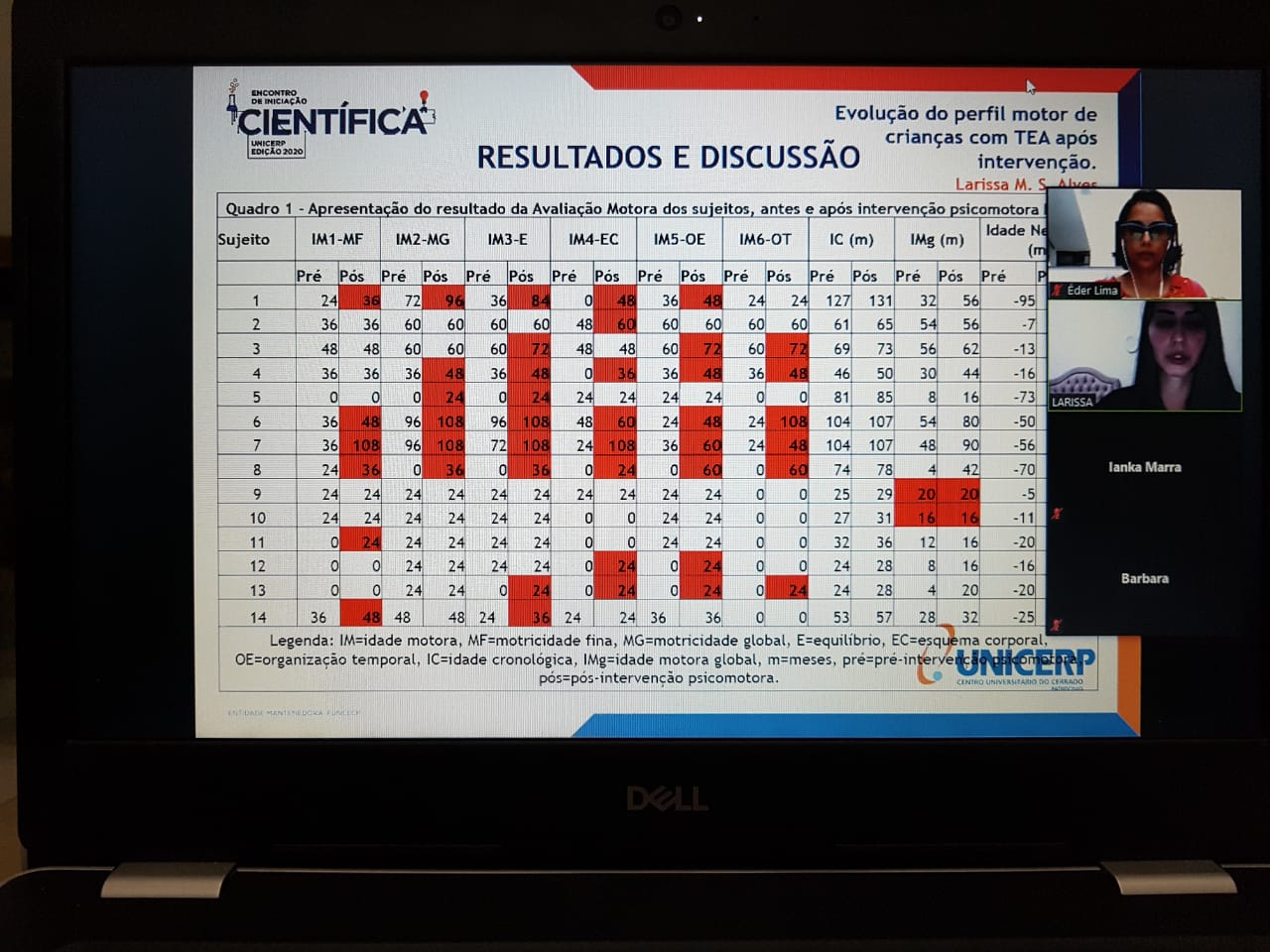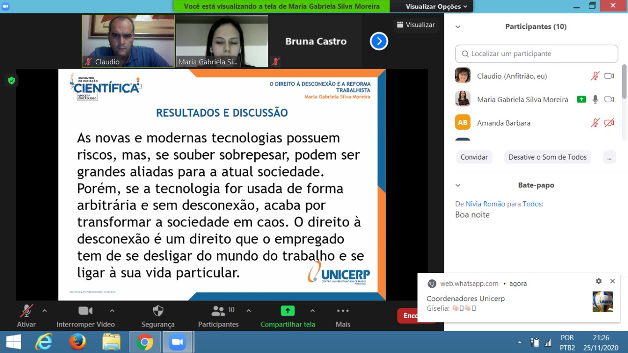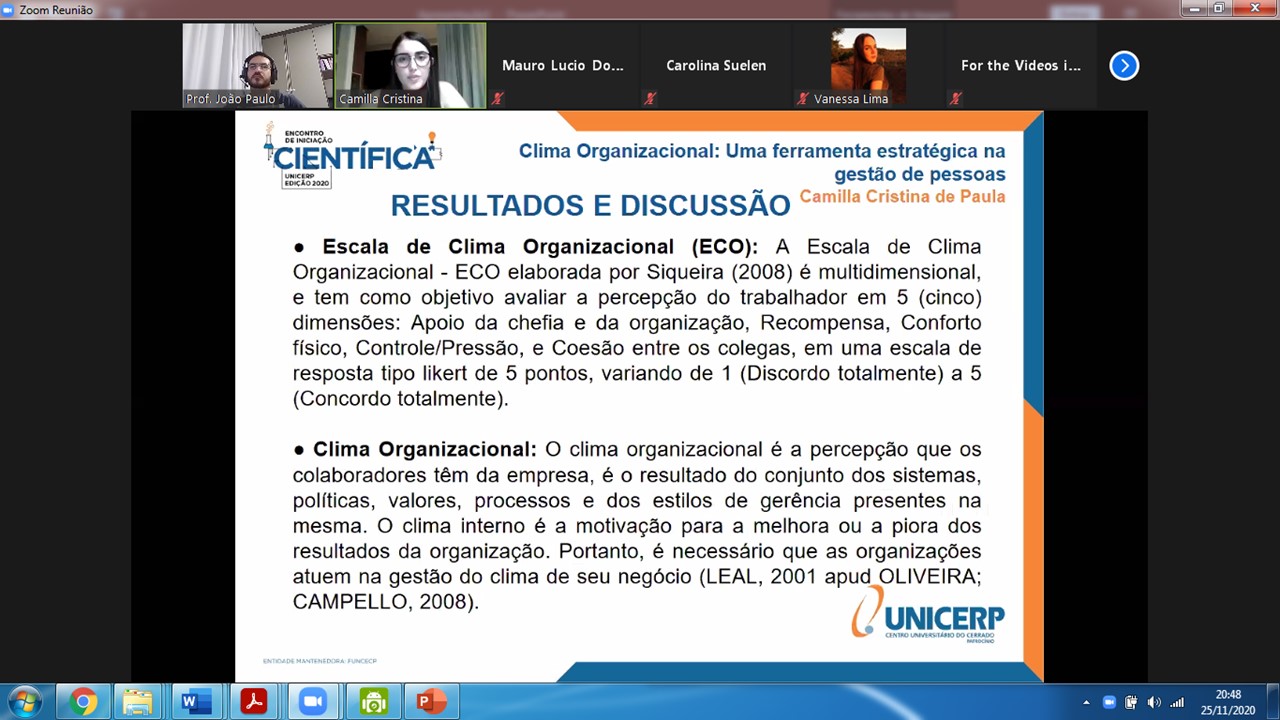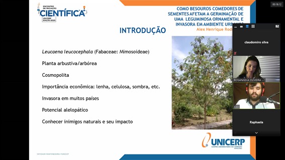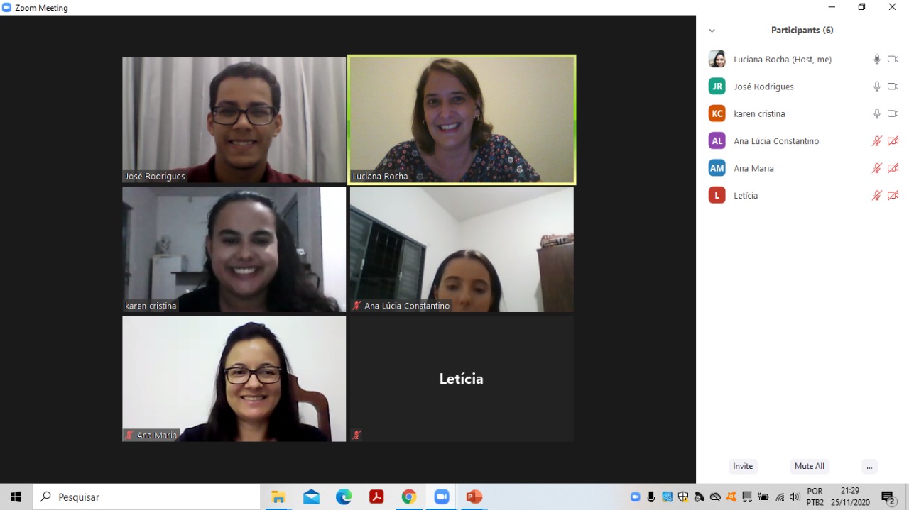 Logo após a palestra, ocorreram as apresentações dos trabalhos deferidos. As exposições foram transmitidas em salas de reuniões do Zoom, com trabalhos foram divididos em áreas temáticas.