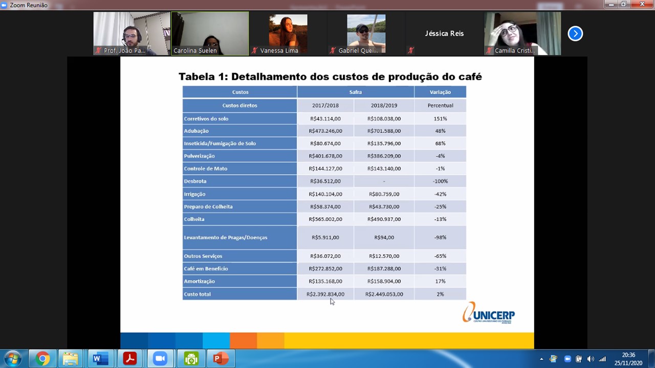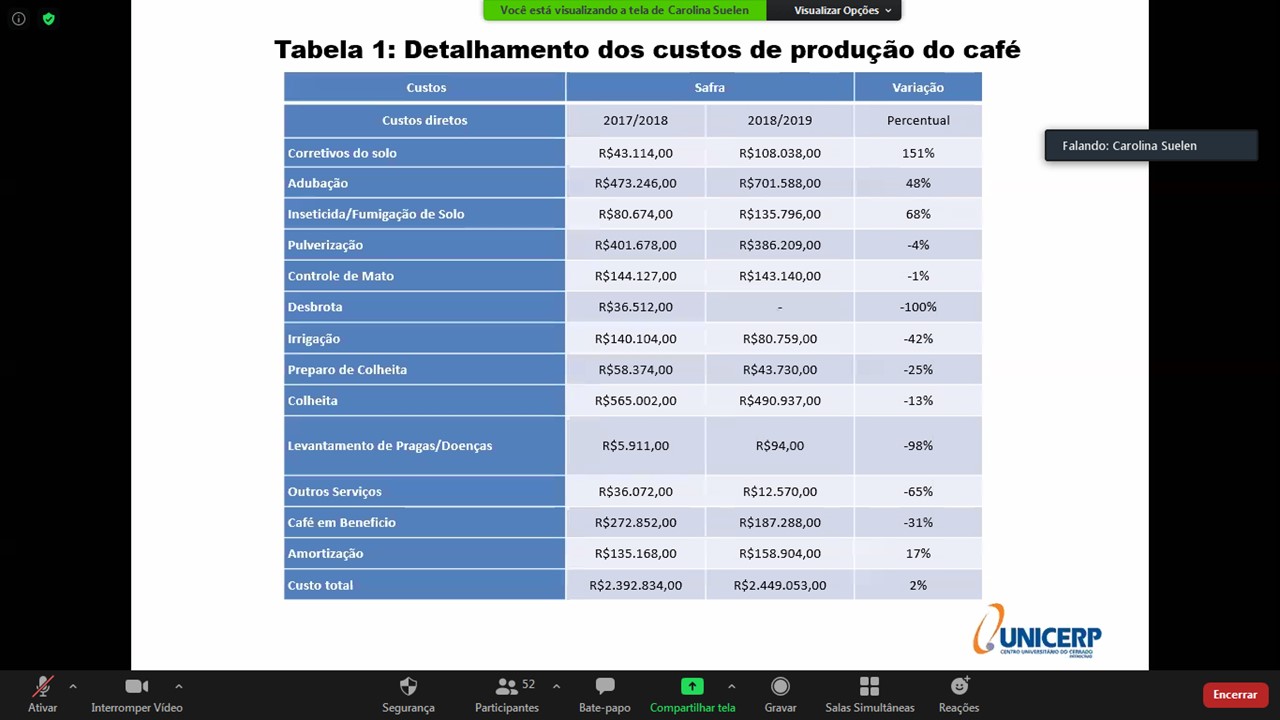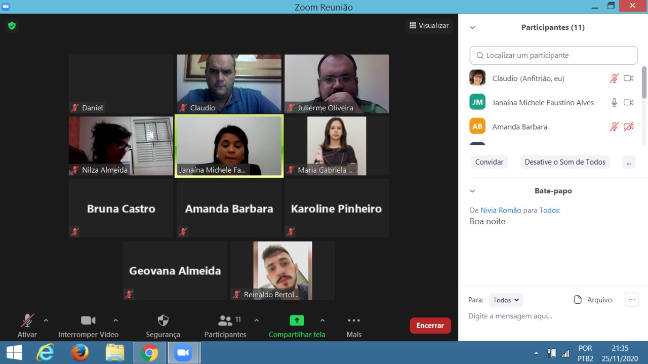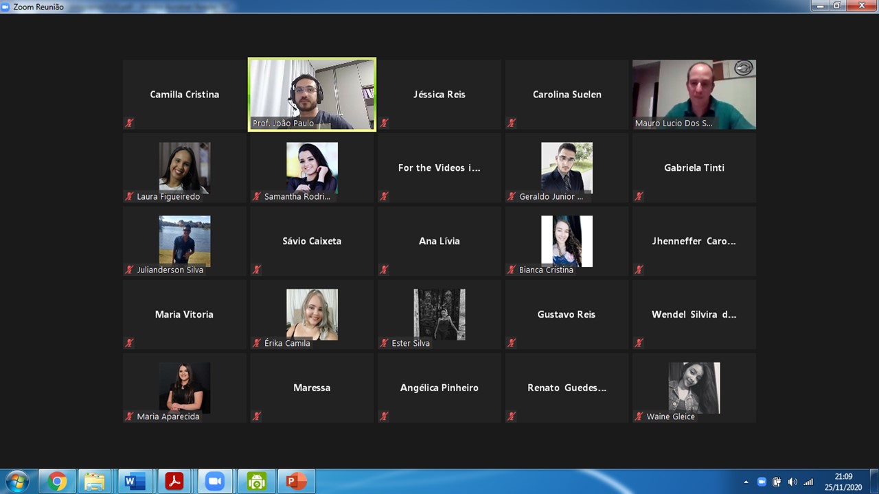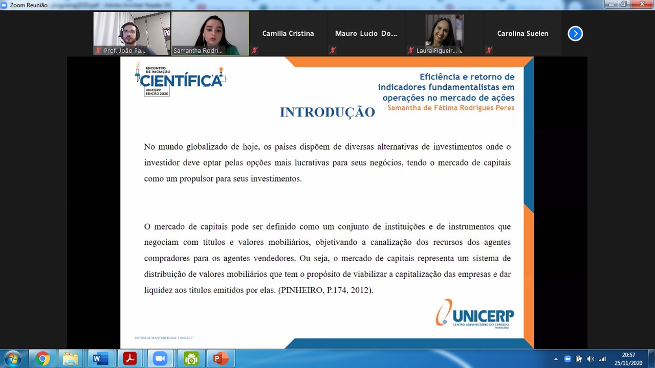 Logo após a palestra, ocorreram as apresentações dos trabalhos deferidos. As exposições foram transmitidas em salas de reuniões do Zoom, com trabalhos foram divididos em áreas temáticas.