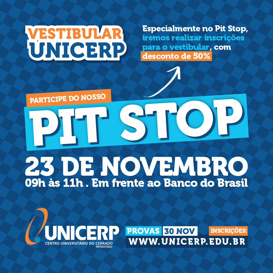 No próximo sábado-feira (23/11), das 8h às 12h, o Unicerp, em parceria com a Rádio Difusora, vai realizar um Pit Stop superespecial em frente ao Banco do Brasil para divulgar o Processo Seletivo 2025!