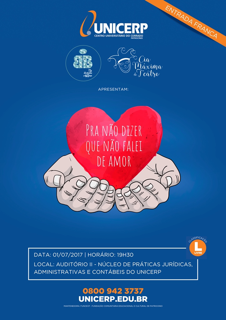 O UNICERP Cultural apresenta no próximo sábado, dia 1º de julho, o espetáculo teatral “Pra não dizer que não falei de amor”. A apresentação acontecerá no Auditório II do Núcleo de Práticas Jurídicas, Administrativas e Contábeis do Centro Universitário do Cerrado Patrocínio, a partir das 19h30.