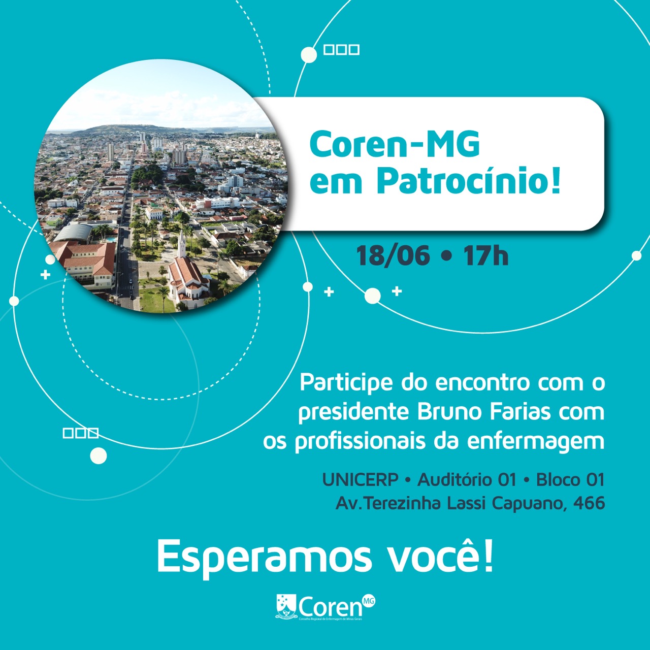 No dia 18 de junho, às 17h, o Presidente do Coren-MG, Bruno Farias, participará de um encontro com os profissionais da enfermagem de Patrocínio e região. O evento acontecerá no auditório I, localizado no Bloco I no UNICERP e está aberto aos profissionais da área.