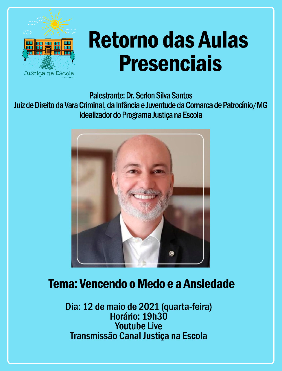 A palestra será ministrada pelo idealizador do Programa Justiça na Escola, Dr. Serlon Silva Santos, Juiz de Direito da Vara Criminal, da Infância e da Juventude da Comarca de Patrocínio. A live tem como objetivo trazer tranquilidade a toda comunidade escolar com esse retorno das aulas presenciais.