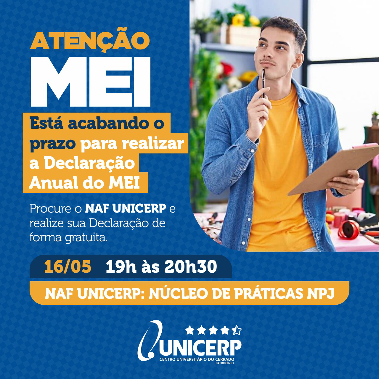 Para auxiliar os MEIs nesse processo, o Núcleo de Apoio Fiscal (NAF) do Unicerp, sob a supervisão da professora Kamilla Mota, estará oferecendo orientação e atendimento gratuito. Os atendimentos serão realizados somente nesta quinta-feira (16/05), das 19h às 20h30, no anfiteatro do Núcleo de Práticas Jurídica.