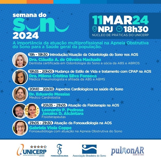 Em parceria com a Associação Brasileira do Sono -ABS, o curso de Fonoaudiologia do Unicerp realizou um evento no dia 11/03/2024 às 18:30 hs, voltado para alunos da graduação e profissionais de saúde, com a participação da odontologia, medicina, fisioterapia e fonoaudiologia, apresentando os mais recentes avanços científicos abrangendo o tema deste ano: “ Oportunidade de Sono a todos para a saúde global” , com uma abordagem ampla sobre os distúrbios respiratórios do sono. Tivemos a participação da Pulmonar Uberlândia e Resmed com stand de exposição de aparelhos CPAPs e máscaras utilizados no tratamento da Apneia Obstrutiva do Sono. Compareceram ao evento presencial 122 participantes.