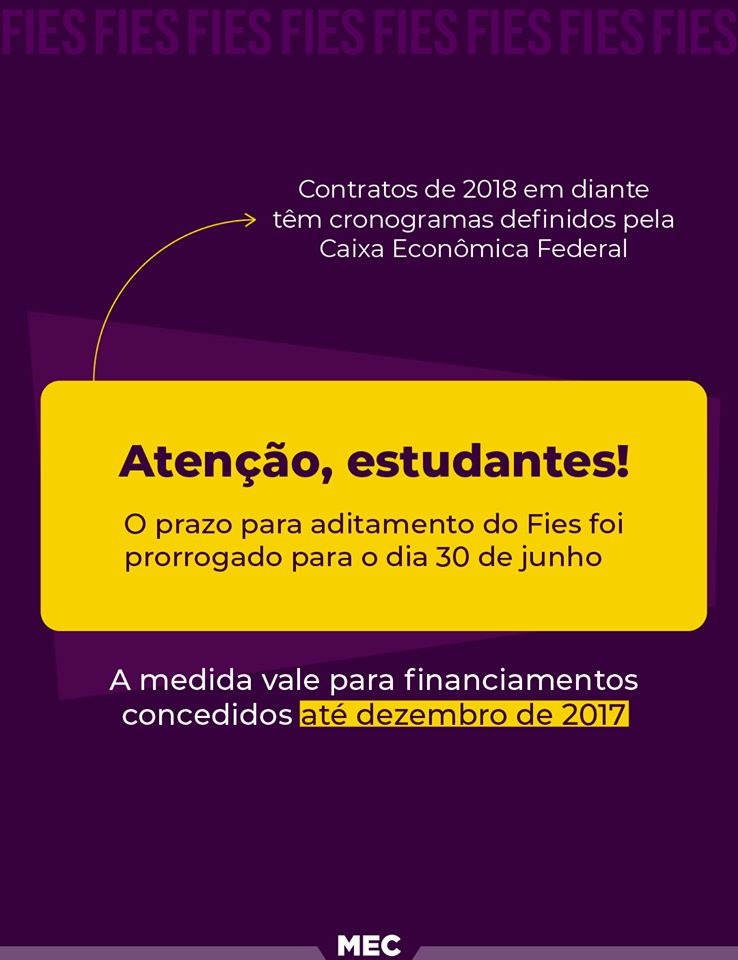 Para os estudantes que tiveram financiamentos concedidos até dezembro de 2017, o prazo de aditamento foi prorrogado até 30 de junho. Para os contratos a partir de janeiro de 2018, os alunos deverão seguir o cronograma definido pela Caixa Econômica Federal.