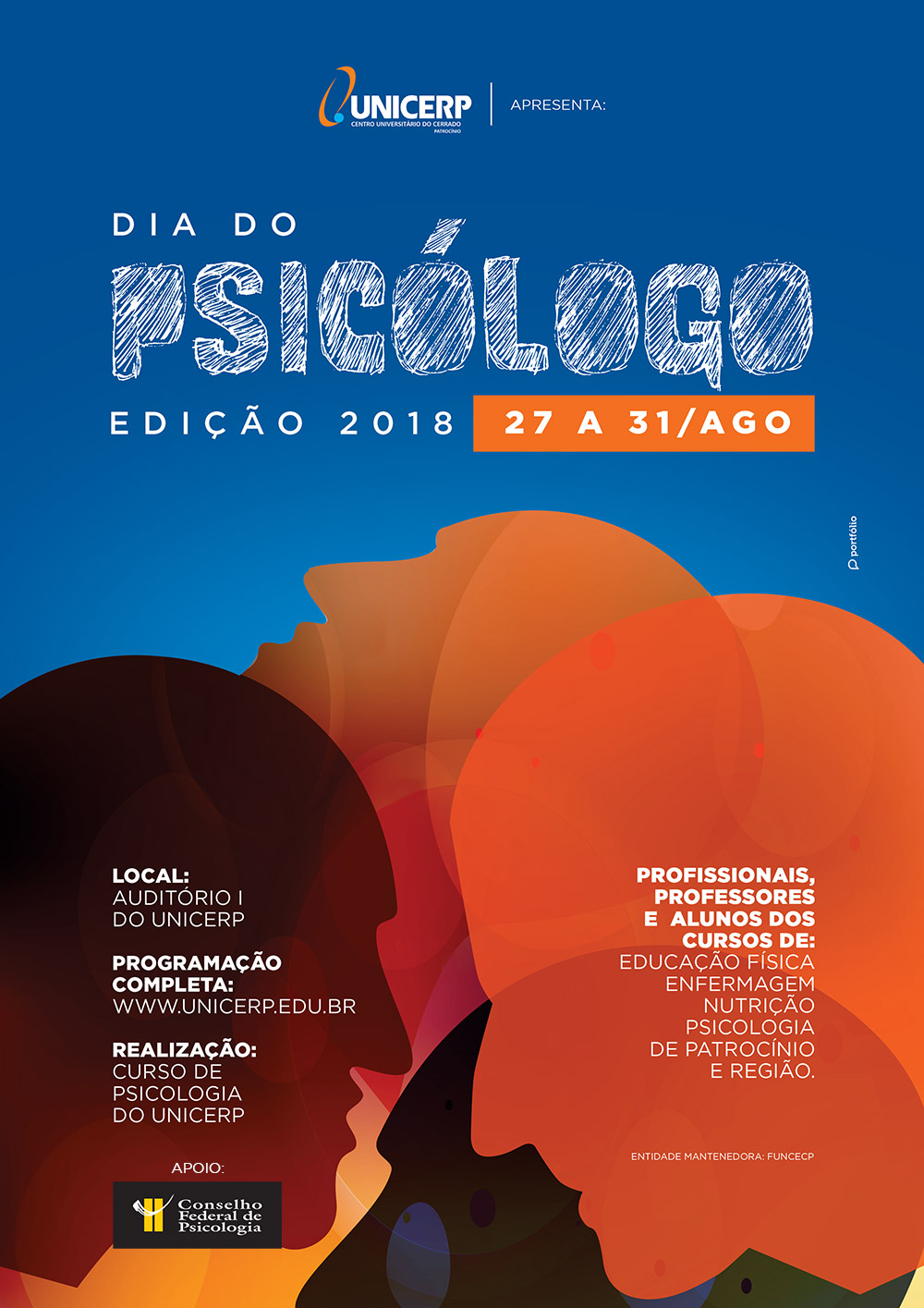 Celebrando dez anos de curso em 2018, a Psicologia do Centro Universitário do Cerrado Patrocínio realizará uma série de atividades em comemoração ao Dia do Psicólogo, 27 de agosto. A programação terá palestra, exibição de documentário e debate sobre atuação profissional. As atividades acontecerão no Auditório I do UNICERP, de 27 a 31 de agosto, a partir das 19h.