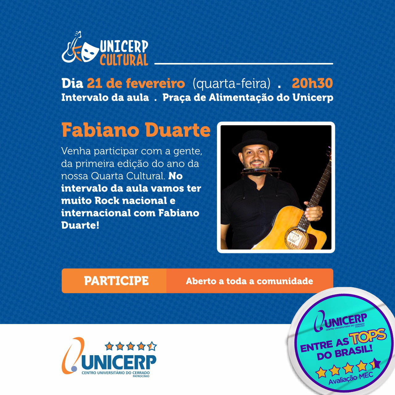 O Unicerp tem a alegria de convidar toda comunidade acadêmica para a primeira edição de 2024 do Projeto "Quarta Cultural", dia 21/02, às 20h30, na Praça de Alimentação. Quem estará com a gente é o músico Fabiano Duarte. Você é o nosso convidado. Venha participar desse grande projeto cultural da instituição!