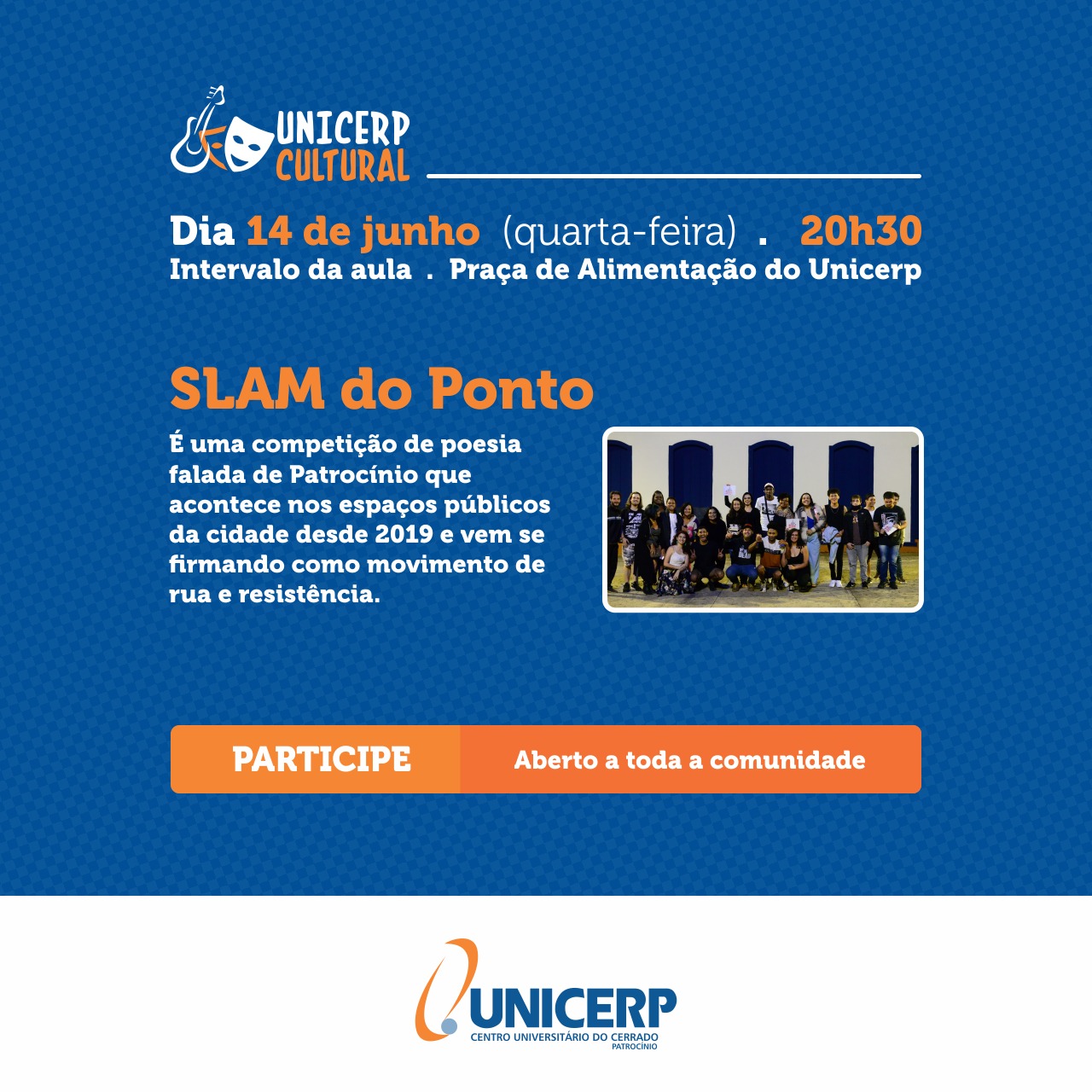 rNesta quarta (14) o Grupo Slam do Ponto trará um pouco de poesia para a comunidade acadêmica do Unicerp.