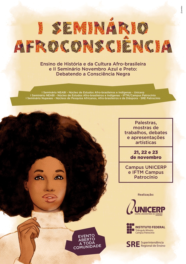 O UNICERP, o IFTM Campus Patrocínio e a Superintendência Regional de Ensino (SRE) realizarão nos dias 21, 22 e 23 de novembro o I Seminário Afroconsciência: Ensino de História e da Cultura Afro-brasileira e o II Seminário Novembro Azul e Preto: Debatendo a Consciência Negra.