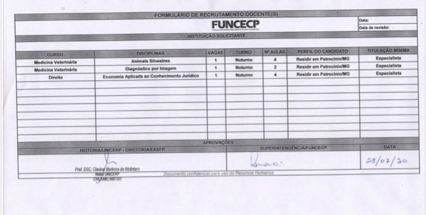 O UNICERP anuncia o recrutamento e seleção de docentes para os cursos de Direito, na disciplina Economia Aplicada ao Conhecimento Jurídico (professor substituto), e Medicina Veterinária, nas disciplinas Animais Silvestres e Diagnóstico por Imagem.