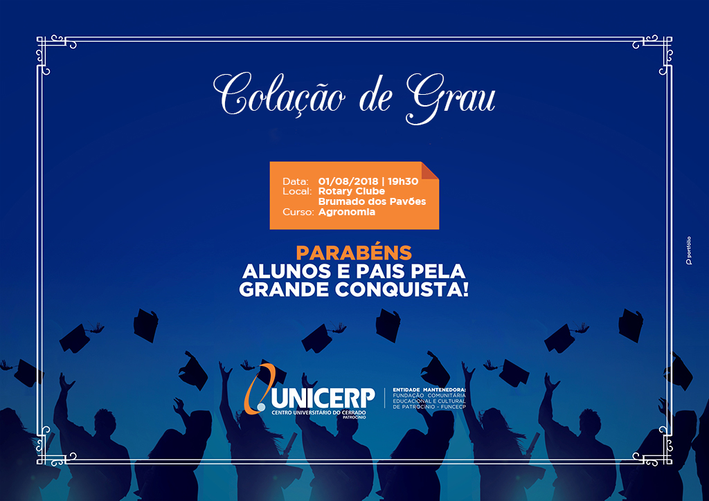 O Centro Universitário do Cerrado Patrocínio convida toda a comunidade a participar da Colação de Grau do curso de Agronomia. A cerimônia será realizada no Rotary Clube Brumado dos Pavões. A colação de grau acontece nesta quarta-feira, 1º de agosto, e terá início às 19h30.