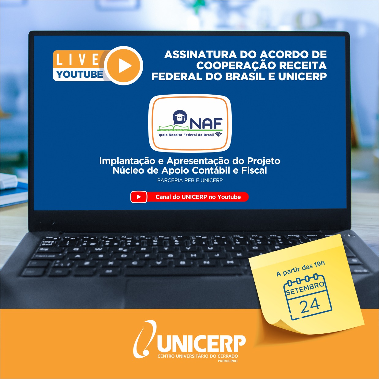 Em parceria com a Receita Federal do Brasil, o curso de Ciências Contábeis do UNICERP está implementando na instituição, o Núcleo de Apoio Fiscal - NAF. A cerimônia de assinatura do Acordo de Cooperação entre as suas partes será realizada nesta quinta-feira, dia 24 de setembro.