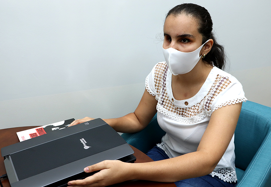 A aluna Ana Karoliny Ferreira, do 5º período do curso de Psicologia do UNICERP, recebeu da Instituição o Scanner com Voz Sara PC. O aparelho vai auxiliá-la na leitura de livros e de materiais didáticos de suma importância para a formação da aluna que possui deficiência visual total.