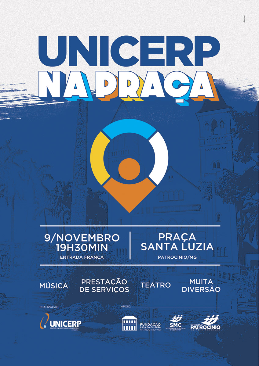 Acontecerá neste sábado, 9 de novembro, o UNICERP na Praça. Com programação voltada para toda a família, o evento será realizado na Praça Santa Luzia, a partir das 19h30.