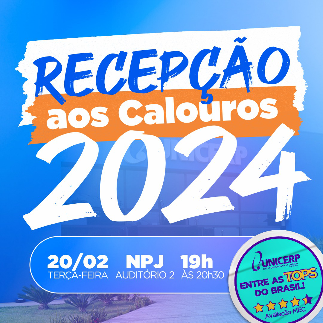 Para celebrar este encontro e o início desta grande jornada convidamos a todos a estar presentes nesta terça-feira (20), às 19h, no Auditório do Núcleo de Práticas Jurídicas! Será um momento de descontração e de conhecer um pouco mais o que o Unicerp tem a oferecer! Esperamos por você!