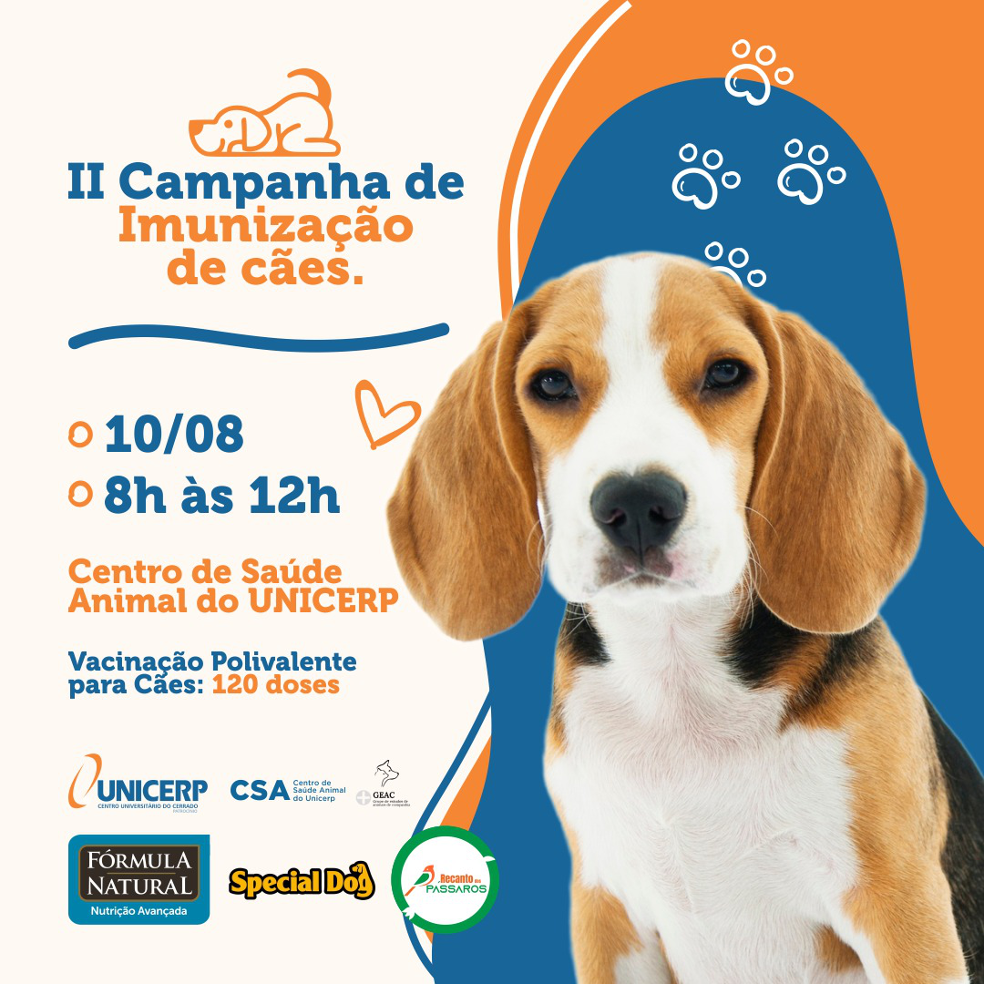 O Unicerp promoverá, no próximo sábado (10), a segunda edição da sua campanha de imunização de cães. O evento, que acontecerá das 8h às 12h no Centro de Saúde Animal da instituição, oferecerá gratuitamente 120 doses de vacina múltipla polivalente, abrangendo até 11 tipos diferentes de cepas.