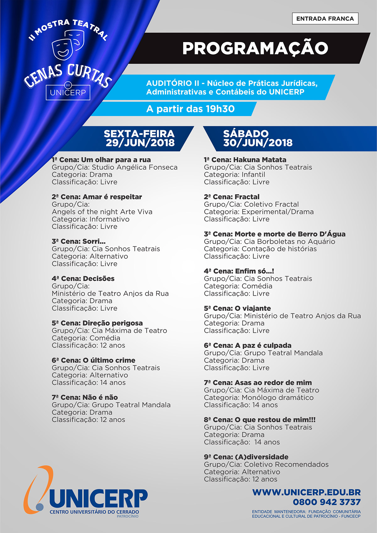 A II Mostra Teatral de Cenas Curtas do UNICERP será realizada às 19h30 dos dias 29 e 30 deste mês. Serão ao todo 16 cenas nos dois dias de apresentação. O evento acontecerá no Auditório II do campus do Centro Universitário do Cerrado Patrocínio.