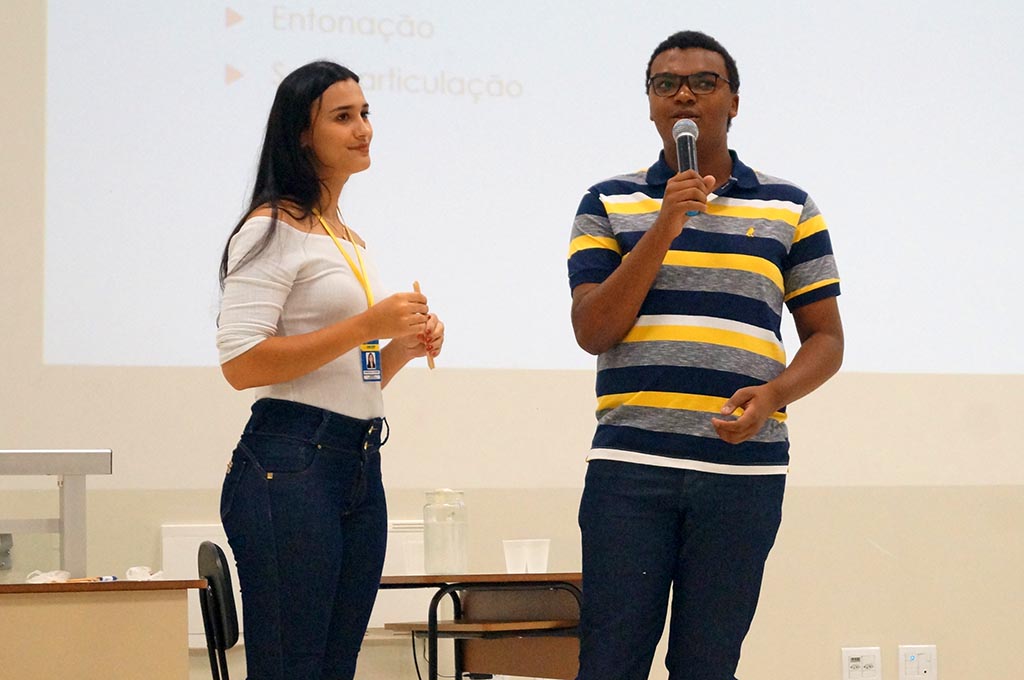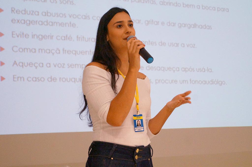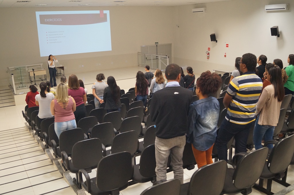 A atividade foi dividida em duas partes. O primeiro momento foi ministrado por Gabriela Cruvinel, aluna do curso de Fonoaudiologia do UNICERP. A palestrante falou sobre os cuidados com voz, além de ensinar técnicas para preservar as pregas vocais, melhoria da articulação mandibular e de aquecimento e desaquecimento vocal.