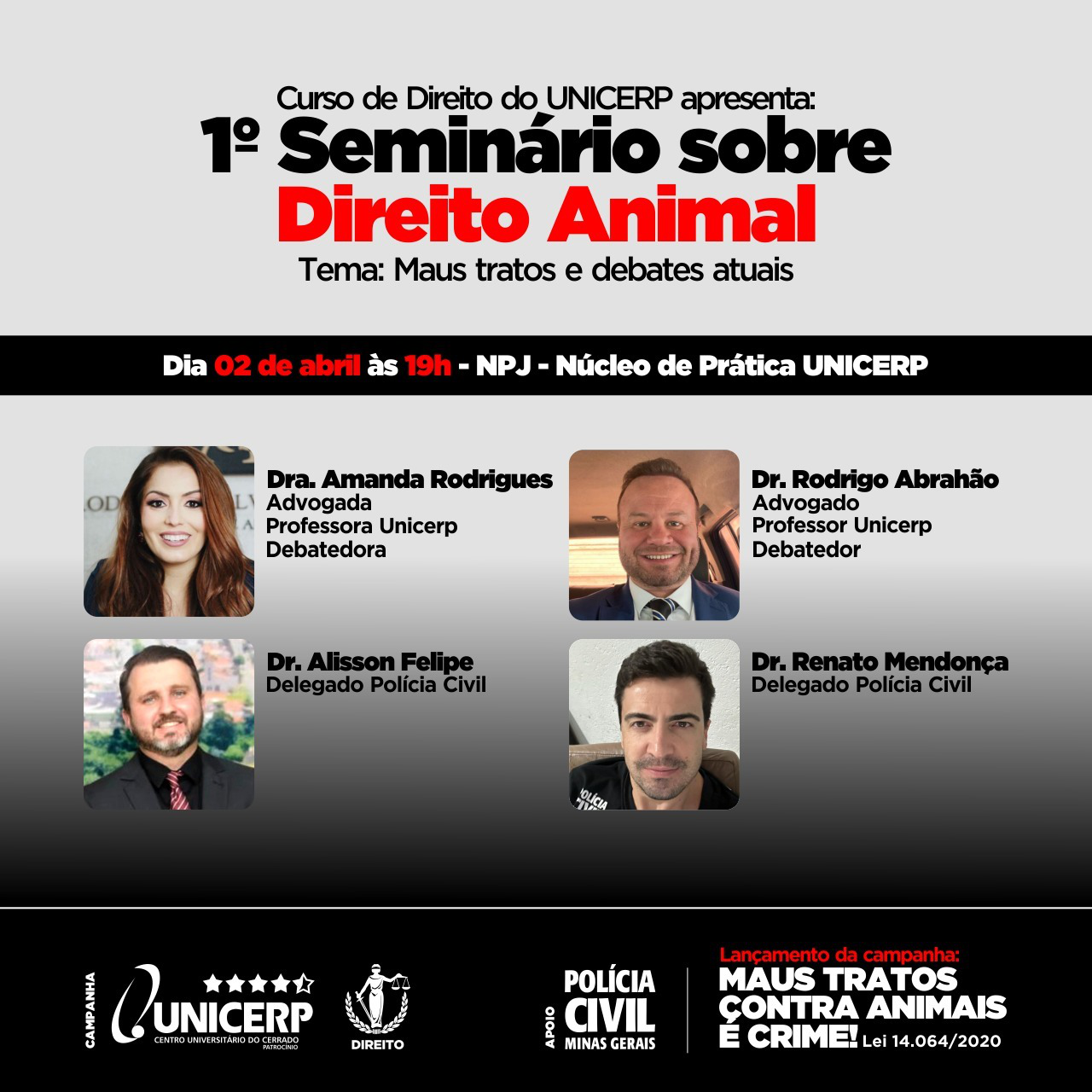 Uma discussão ampla a respeito do tema está marcada para o dia 02 de abril, às 19h, no Auditório do Núcleo de Práticas Jurídicas do Unicerp, durante o 1º Seminário sobre Direito Animal.