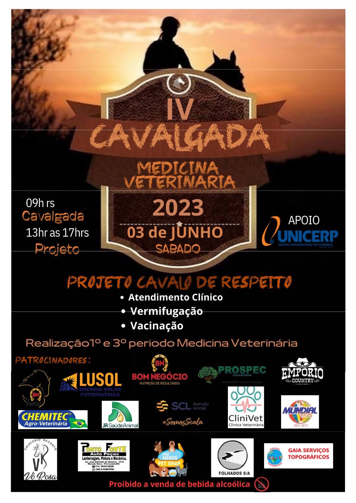 Um evento que já se tornou tradicional em Patrocínio será realizado este ano no dia 3 de junho. É a Cavalgada promovida pelo curso de Medicina Veterinária do Unicerp e que já está em sua 4ª edição. Aberto ao público e totalmente gratuita, a Cavalgada tem como objetivo promover a interação entre as turmas de Medicina Veterinária, entre os demais cursos do Unicerp e entre toda a sociedade de Patrocínio e região que deseje participar também.