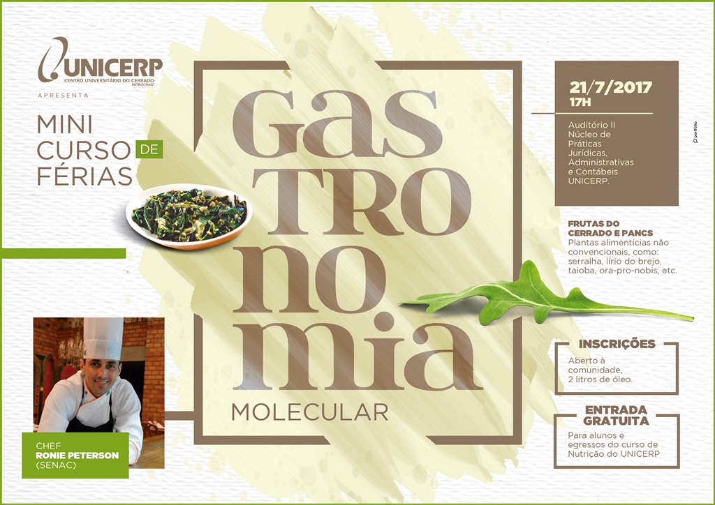 O curso de Nutrição do UNICERP oferecerá no dia 21 de julho o minicurso Gastronomia Molecular. A atividade será ministrada pelo chef Ronie Peterson. O evento começa a partir das 17h, no Auditório II Núcleo de Práticas Jurídicas, Administrativas e Contábeis do Centro Universitário do Cerrado Patrocínio.