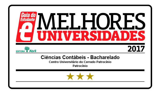 Foi divulgado pela Editora Abril nesta quarta-feira, dia 30, que os cursos do Centro Universitário do Cerrado Patrocínio novamente estão entre os melhores do país. Em 2017, foram estrelados os cursos de Administração, Ciências Contábeis, Direito, Enfermagem, Fisioterapia, Fonoaudiologia e Psicologia.