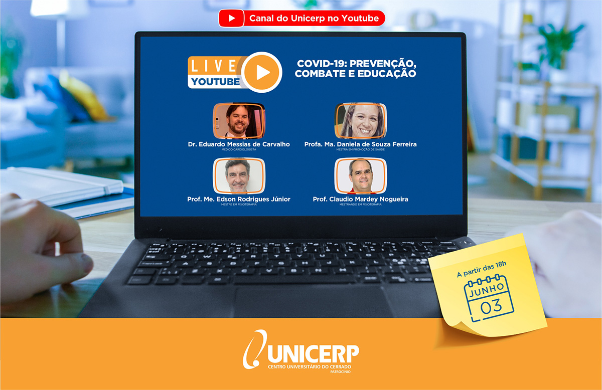 A live do UNICERP nesta quarta-feira, dia 3, vai debater os impactos do Covid-19, alertando sobre a prevenção, o combate e as mudanças na educação. O convidado especial será o médico cardiologista Dr. Eduardo Messias de Carvalho Teixeira. Também participarão da conversa os professores do UNICERP, Claudio Mardey Nogueira, coordenador do curso de Fisioterapia, Ma. Daniela de Souza Ferreira, coordenadora do curso de Enfermagem, e Me. Edson Rodrigues Júnior, supervisor de estágio do curso de Fisioterapia.