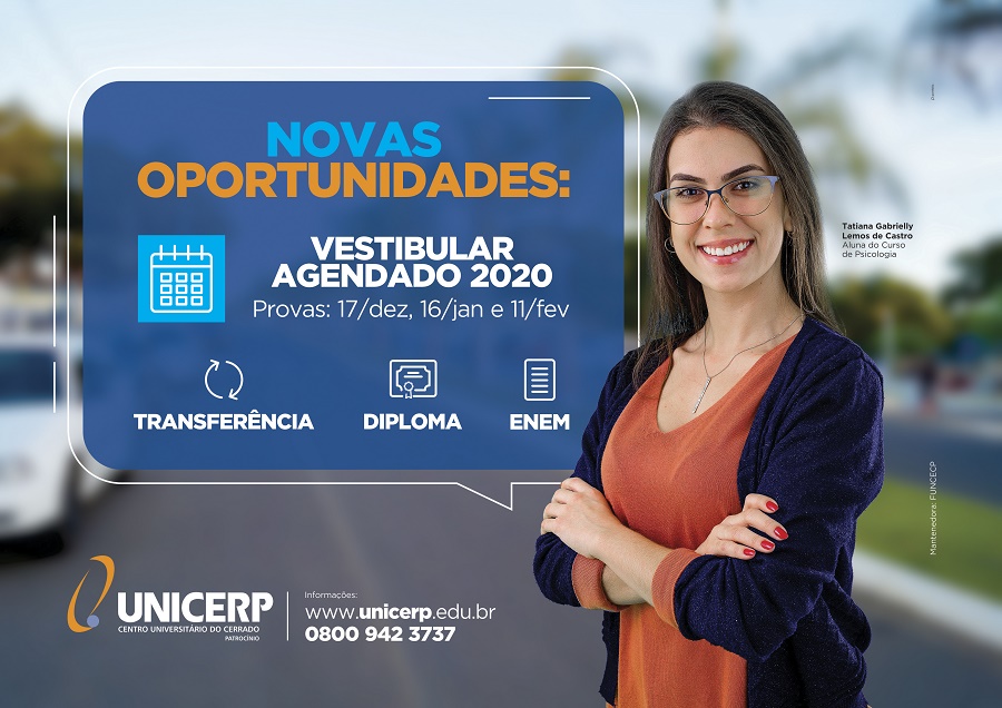 A próxima prova do Vestibular Agendado UNICERP 2020 acontecerá em 16 de janeiro. As inscrições estarão abertas até o dia da prova. A avaliação terá início às 19h30, no campus do Centro Universitário do Cerrado Patrocínio. O processo seletivo avaliará candidatos através de uma redação.