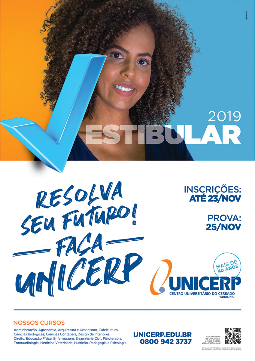 O Centro Universitário do Cerrado Patrocínio realizará no dia 25 de novembro, domingo, das 9h às 12h, o Vestibular UNICERP 2019. As inscrições seguirão abertas na página www.unicerp.edu.br. O candidato terá até o dia 23 de novembro para se inscrever. A taxa é de R$ 50.