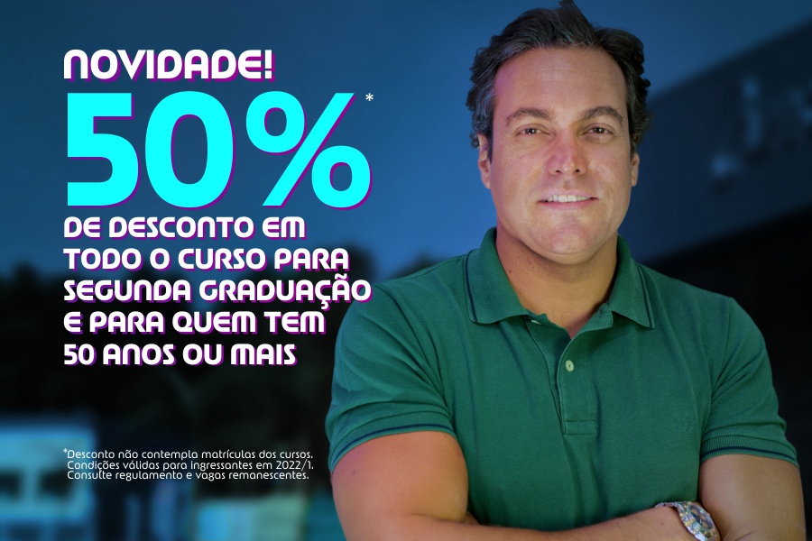 A grande novidade em 2022 é 50% de desconto em todo o curso (exceto matrícula) para segunda graduação ou para quem tem 50 anos ou mais. Clique aqui para consultar o regulamento.